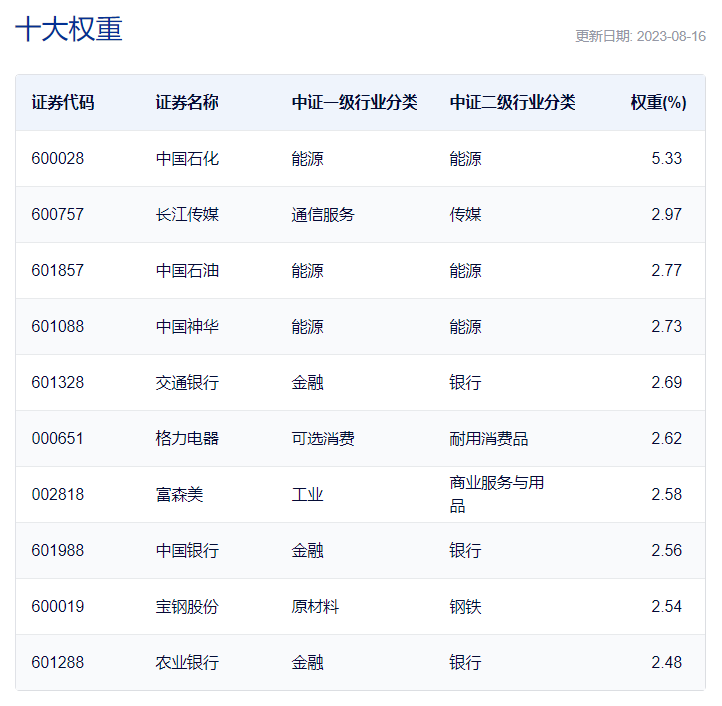 截至2023年7月底,指数市盈率(TTM)5.89倍,市净率0.6倍,股息率5.41%。