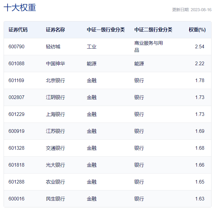 截至2023年7月底,指数市盈率(TTM)6.84倍,市净率0.67倍,股息率4.62%。