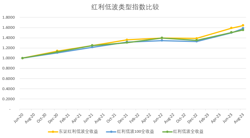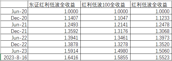 从2020年7月1日至2023年8月16日,这三只全收益指数的收益率分别是55.23%、58.55%、64.16%,显然东证红利低波指数的收益率比较高,但是没有超出一成。
