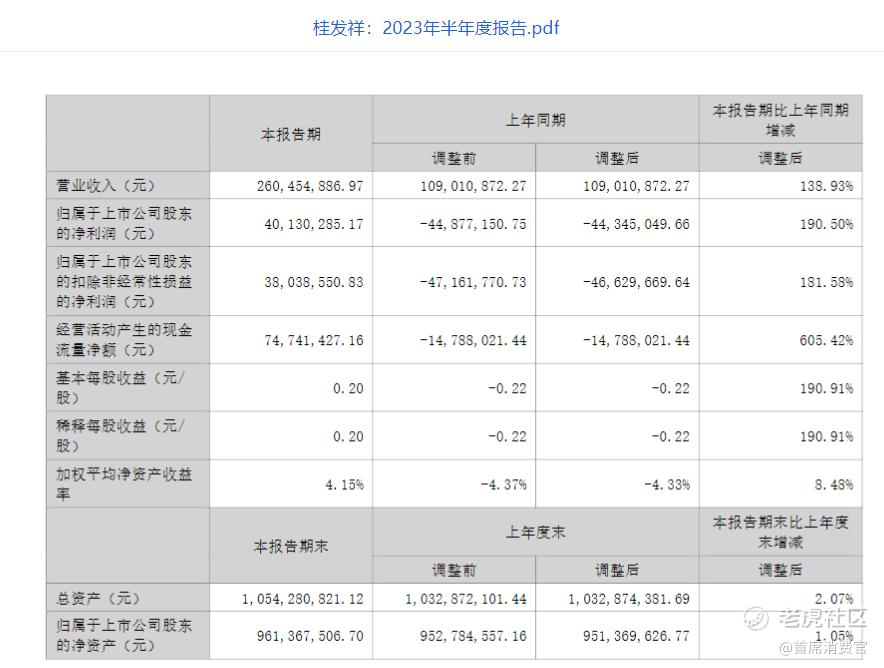 【桂发祥:上半年营业收入2.60亿元】桂发祥公布2023年半年度报告,报告期实现营业收入2.60亿元,同比增长138.93%;归属于上市公司股东的净利润0.40亿元,同比增长190.50%;基本每股收益0.20元。(公司公告)