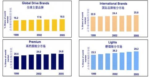 总体来说,整个全球卷烟市场持续稳步缓慢下滑,但高档品牌以及国际品牌的细分市场不断增加。
