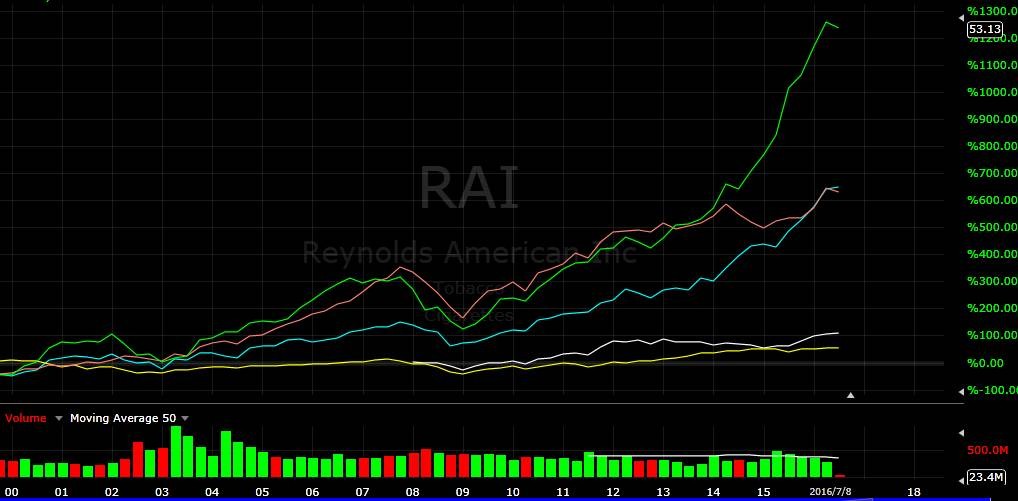 上图是从2000——2016年的美股标普500 SPY期货对比香烟板块4只股票的价格走势图,相对的强势非常明显。