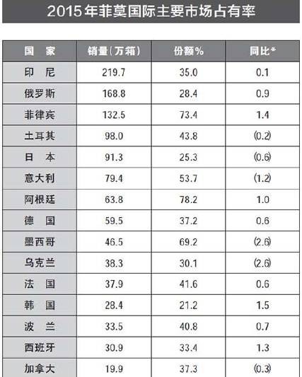 菲莫、英美、日本烟草、帝国 四家国际烟草公司据2015年的数据,已占领全球除中国市场外的78%的市场份额。