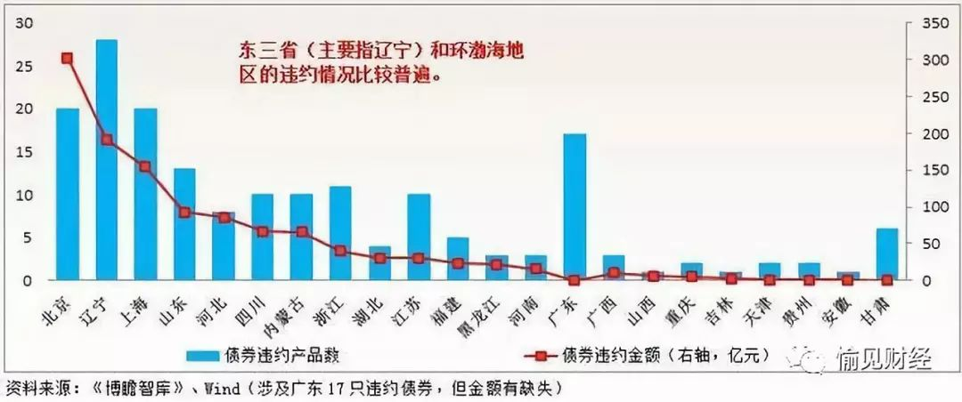 从债券违约地域分布来看:“愉见财经”统计,今年上半年的债市雷区分布图为:辽宁5只、黑龙江3只(咳咳,东北兄弟承包了三成),北京4只、上海4只、福建2只、湖北2只、四川2只。