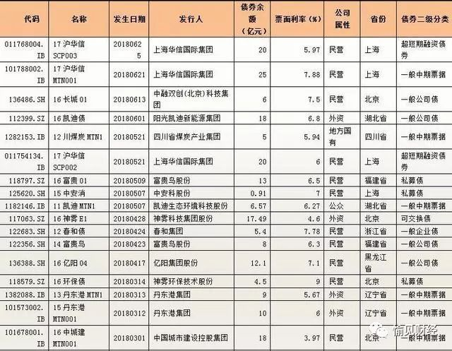有7家主体信用债发生首次违约:亿阳集团、神雾环保、富贵鸟、中安消、凯迪生态、上海华信、中融双创。