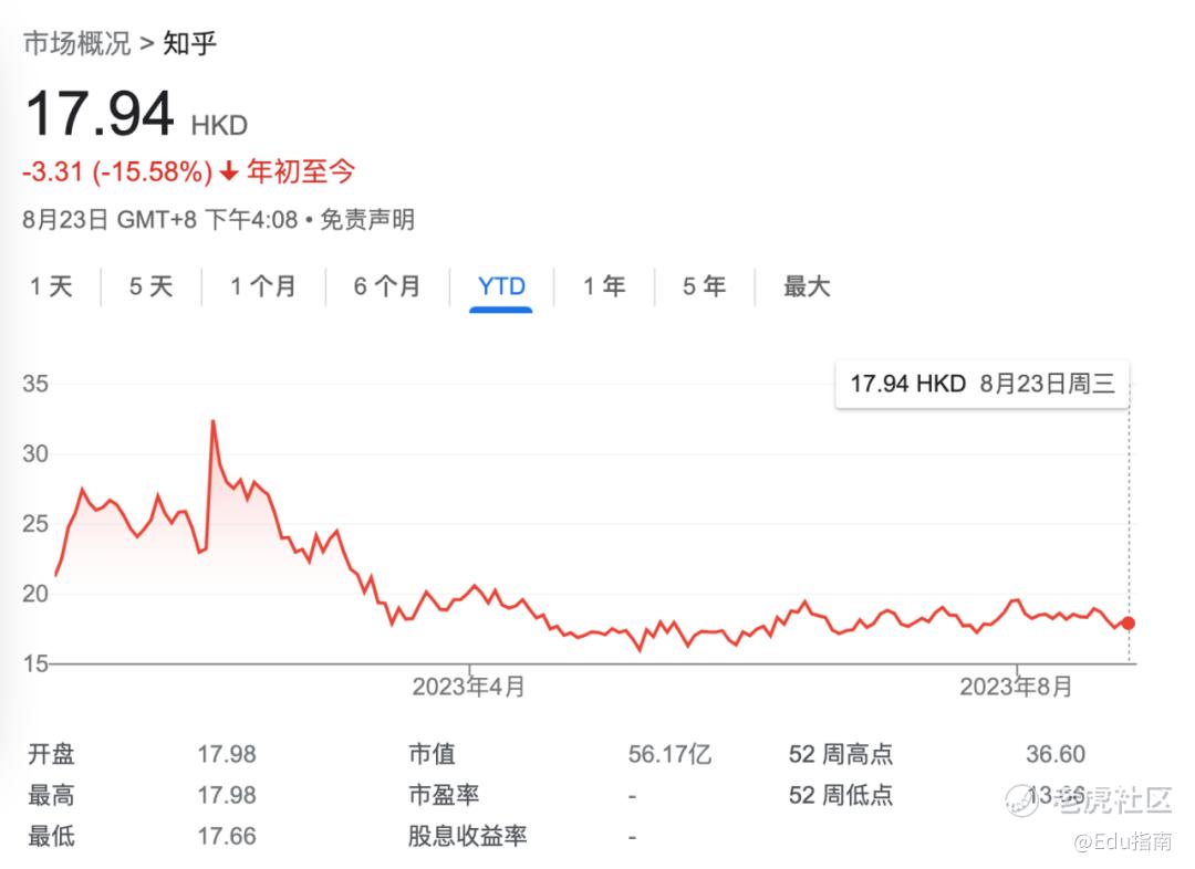 截至本文,知乎公司今年以来股价下跌16%,当前市值为56亿港元。