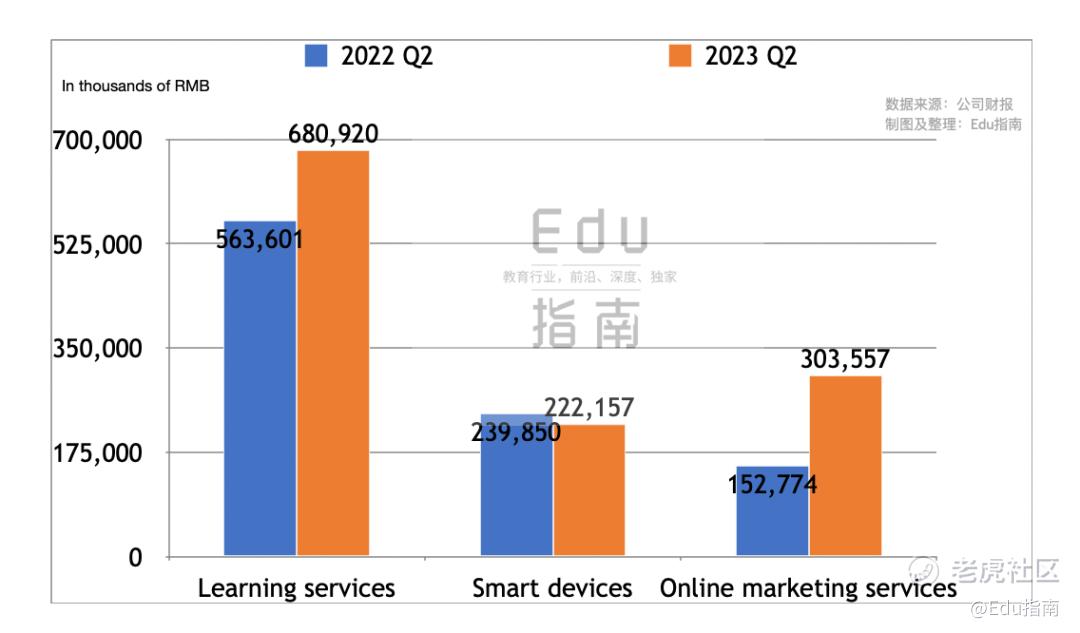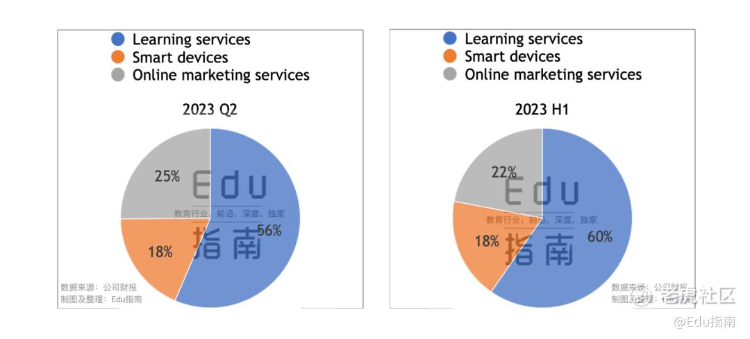 从收入占比来看,该公司2023年Q2学习服务、智能硬件收入占比分别为56%、18%,两部分业务累计占比74%,在线营销服务季度收入占比为25%。上半年其学习服务、智能硬件收入占比分别为60%、18%,两项业务分部累计占比78%,在线营销服务上半年收入占比为22%。