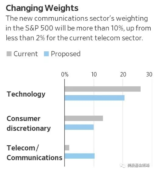 从影响来看,三个板块将受到影响,科技板块在本次调整后,切去一大块市值,在标普500指数中的市值权重将从27%减少到20%出头,而非必需消费品板块市值也略有损失。传统电信板块在标普500指数中的占比只有2%,但是经过本次调整升级后,最新的“通讯服务”板块占比将超过10%。