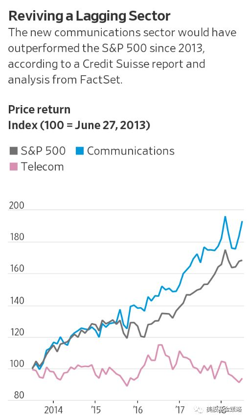机构也做了一个模拟,以2013年6月27日为起点,按照现在的通讯服务板块走势与标普500指数、电信板块做对比。可以看到,通讯服务板块将获得超过90%的涨幅,优于标普500指数70%左右的涨幅,更大大好于传统电信板块近10%的跌幅。