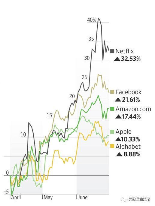 在二季度,主要科技龙头股都表现出色,奈飞依然势如破竹,大涨32%,走出“数据门”阴霾的Facebook也终于跟上科技板块上涨的节奏,创出新高。相对涨的温和的苹果和谷歌,也分别有10.33%和8.88%的涨幅。