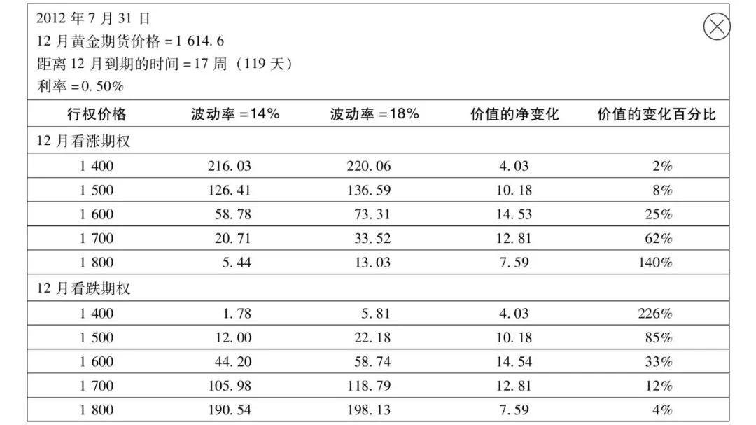 (2)以百分比形式,波动率的变化对虚值期权的影响将大于相应的实值期权或平值期权。