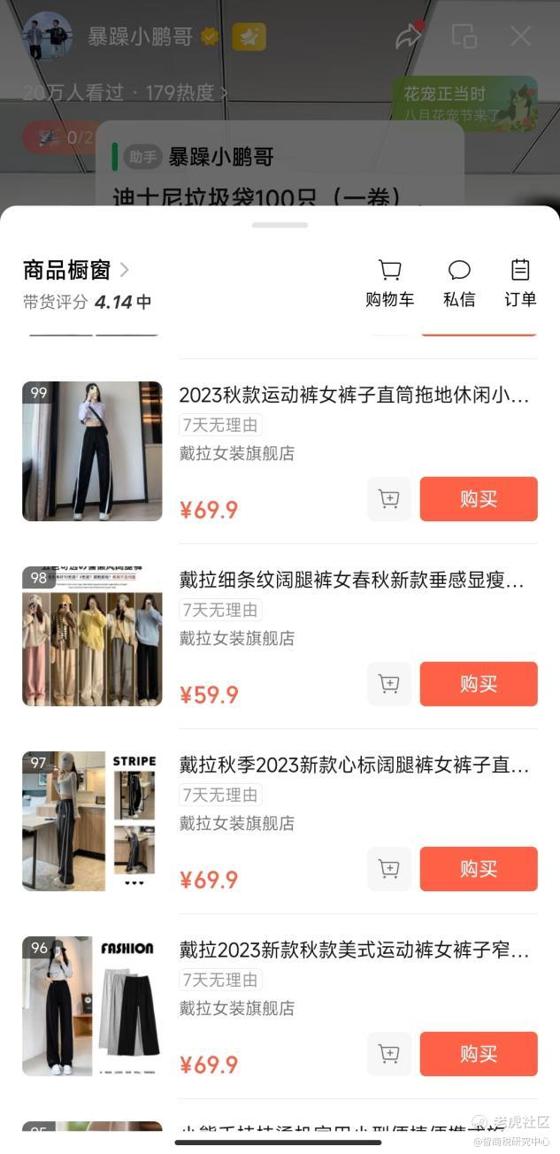 比如,潘哥发现“暴躁小鹏哥”的直播间里,售卖的商品有迪士尼大卷垃圾袋、戴拉女士阔腿裤、奥康冲锋衣。