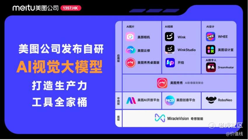 作为曾经的国民修图软件,美图工具属性难以变现的毛病被无限放大,但随着AI时代的到来,工具价值迎来了大爆发;美图回归工具价值本身,从生活娱乐工具转向生产力工具,实现了B端、C端的全方位覆盖。