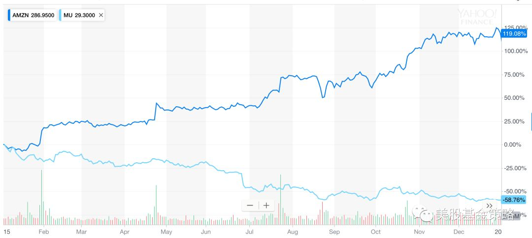 从埃因霍恩的绿光资本与对冲基金指数、标普500指数的收益率比较来看,其业绩的转折点在2010年,此前大部分时间都战胜市场和业界基准。但是,2010年以后,其业绩就开始落后市场,2015年更是遭受重创,用他在给投资者的信中的说法就是,连他儿子也问他,为啥做空上涨的股票,做多下跌的股票。是的,那一年埃因霍恩的一大投资就是做空亚马逊(以及奈飞),另一大投资是做多美光科技,这两只股票当年的走势是这样的: