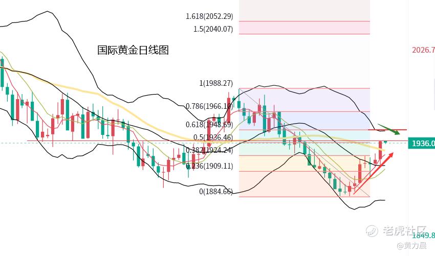 昨日周二亚欧盘,黄金在1987跌至1884的0.382回撤位置,即1924美元附近遇阻承压,最低跌至1914美元,在日线布林带中轨位置获得支撑,这基本符合我们的预期,不过美盘开盘后,金价企稳反弹,并向上取得突破,最高涨至1938美元,在0.5回撤位置附近遭遇阻力,此后黄金保持横盘震荡,并一直延续到周三,目前金价暂时交投于1936美元附近。