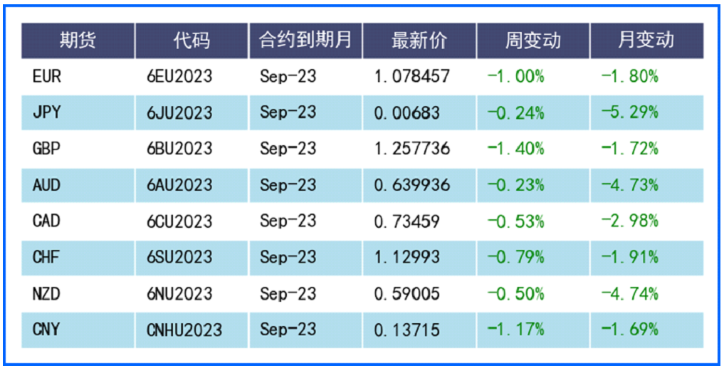 上周美国10年期国债收益率创下2007年11月以来新高4.366%,月累计涨幅接近40个基点,主因是美国经济保持强韧令市场认为美联储将长时间维持高利率。美元指数也随着美债收益率起伏波动,周线连续第六周上涨。而鲍威尔鲍威尔在杰克逊霍尔央行年会上的讲话略也偏鹰派,中心思想仍然是通胀仍过高,但是否进一步加息由数据决定,不过市场对此的反应是美元继续震荡走高。