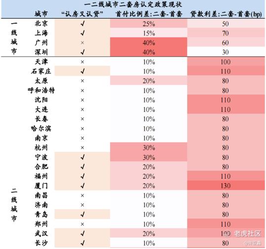如下图所示,在“认房又认贷”条件下,北京、上海、广州、深圳普通住宅二套房首付比例分别为80%、70%、70%、70%,比首套首付高出40%~45%,房贷利率差最高达到了70BP。