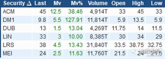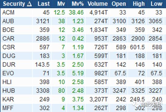 涨幅大于10%,成交金额>50万澳元个股: