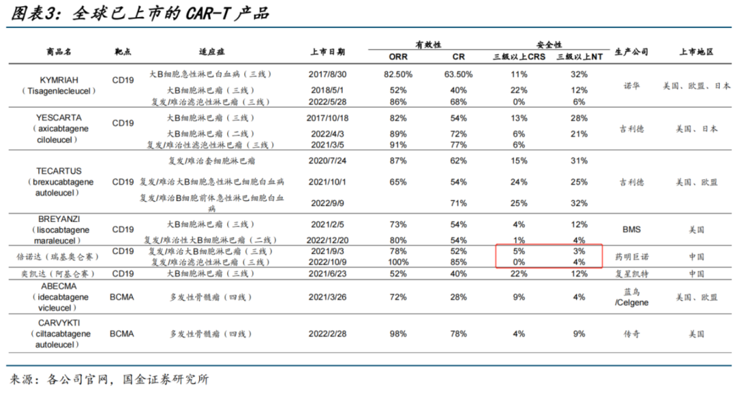 放眼全球已上市的CAR-T疗法,无论是大卖的吉利德Yescarta还是领域首款上市的Kymriah,其治疗大B细胞淋巴瘤成熟临床数据的三级以上CRS、NT副作用率分别均高于10%、25%,给患者带来了较大的安全性风险。