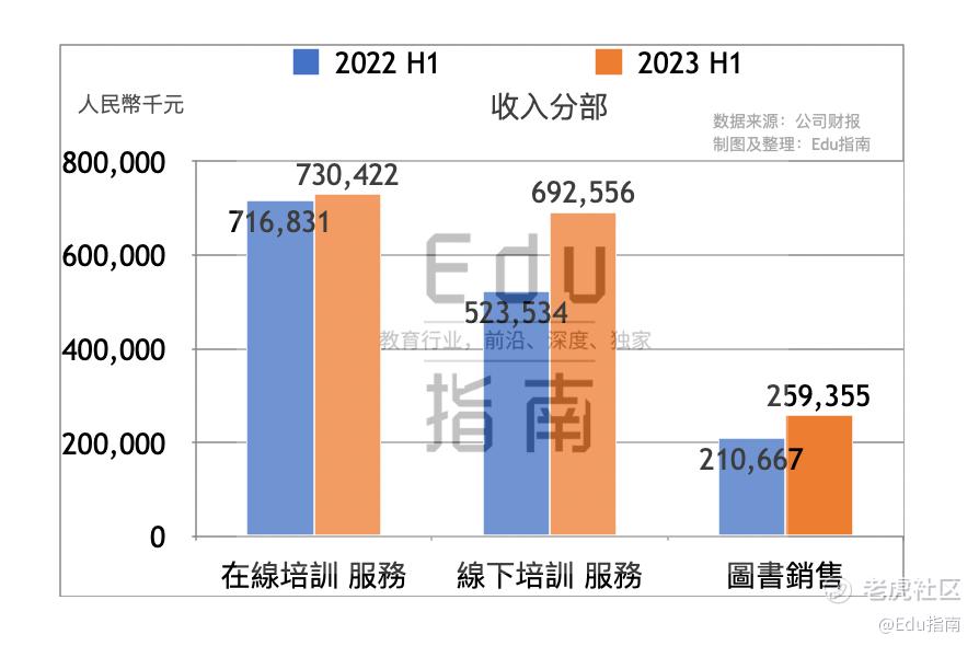 该公司收入来自在线培训服务、线下培训服务、销售图书三分部。上半年该公司三分部业务分别表现为同比增长,线下培训服务收入增幅较高。