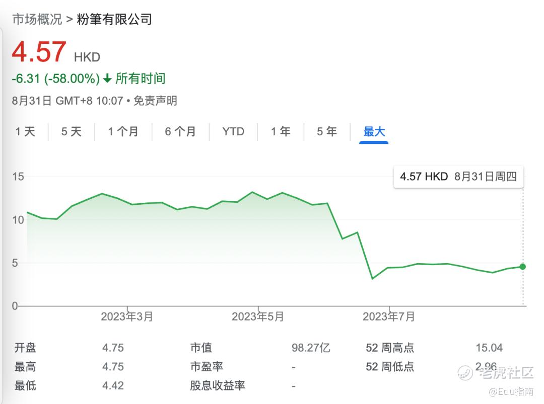 截至本文,粉笔公司股价自上市以来跌去58%,当前市值为98亿港元。