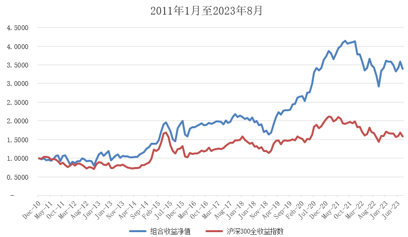 实际组合从2011年初至2023年8月末净值是从1元至3.39元。年化收益率是10.1%。