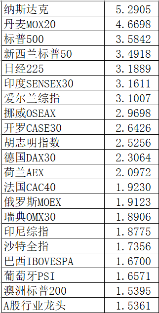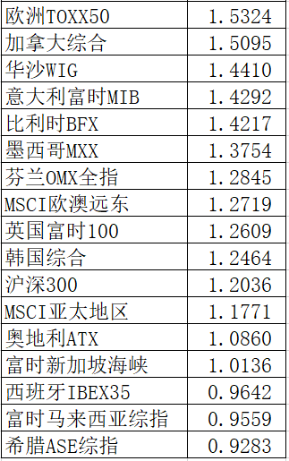 沪深300指数比MSCI亚太地区指数的收益稍微好点,38只中排第32名。A股行业龙头指数比欧洲TOXX50指数的收益稍微好点,38只中排第21名。