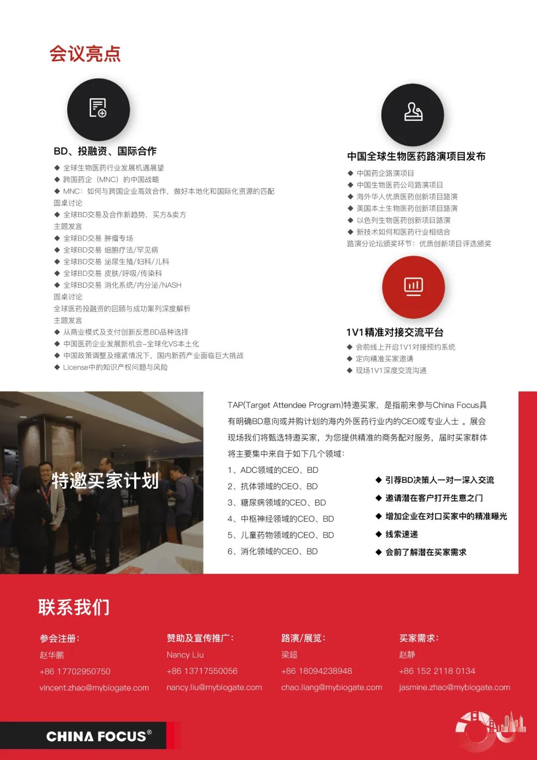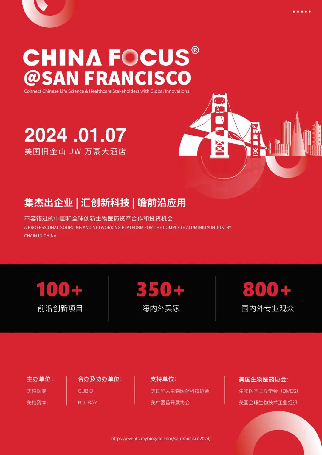 为了让更多的中国创新药企在国际舞台展示创新成果,同时为中国和全球的生物医药力量搭建互动、对接的交流平台,我们特地在一年一度的全球最大的生物医药盛会——J.P.Morgan Week期间举办2024 China Focus@San Francisco会议,希望借此聚集来自全球顶尖的生物医药创新力量,促进新时代下中国与全球领先的生物医药企业的交流与合作,推动中国生物医药出海向前发展。