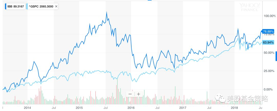 从生物医药的代表ETF:IBB来看,经历了2015年的重创后,其实整体还是在恢复元气,重新回到向上的轨迹,只是更舒缓了一些。
