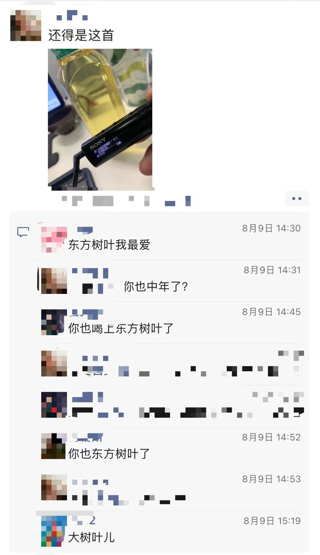 无论是从前靠红牛支棱的大哥,还是只喝依云的小老板,就连朋友圈嚼槟榔的兄弟,随手拍都换成了东方树叶,像手办一样跟着他旅行,底下评论区里的兄弟,统一都在相互问候,“你也喝上了东方树叶?”
