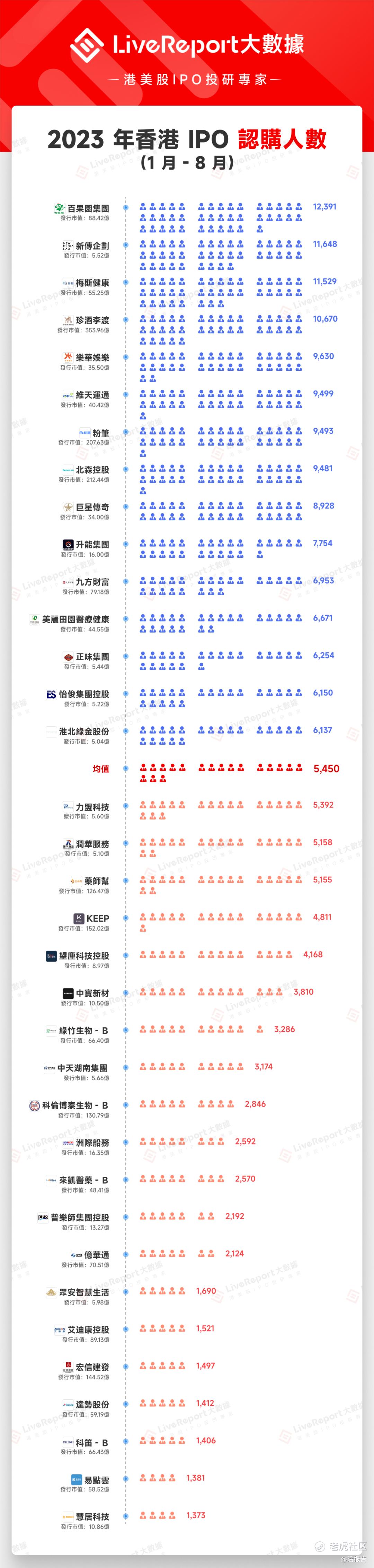 从认购人数来看,新股平均认购人数为5450人。认购人数最多的是百果园集团,共12391人认购。认购人数过万人的还有新传企划、梅斯健康、珍酒李渡三家。