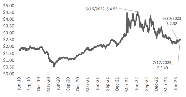尽管自公司 2023 年第一季度指导以来,价格小幅上涨了 3.5%,但总体趋势自年初以来一直呈持续下降趋势。