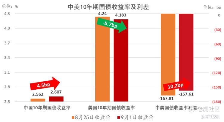 上周中国10年期国债涨5.9bp,美国10年期国债涨8.3bp,中美利率差跌2.5bp。