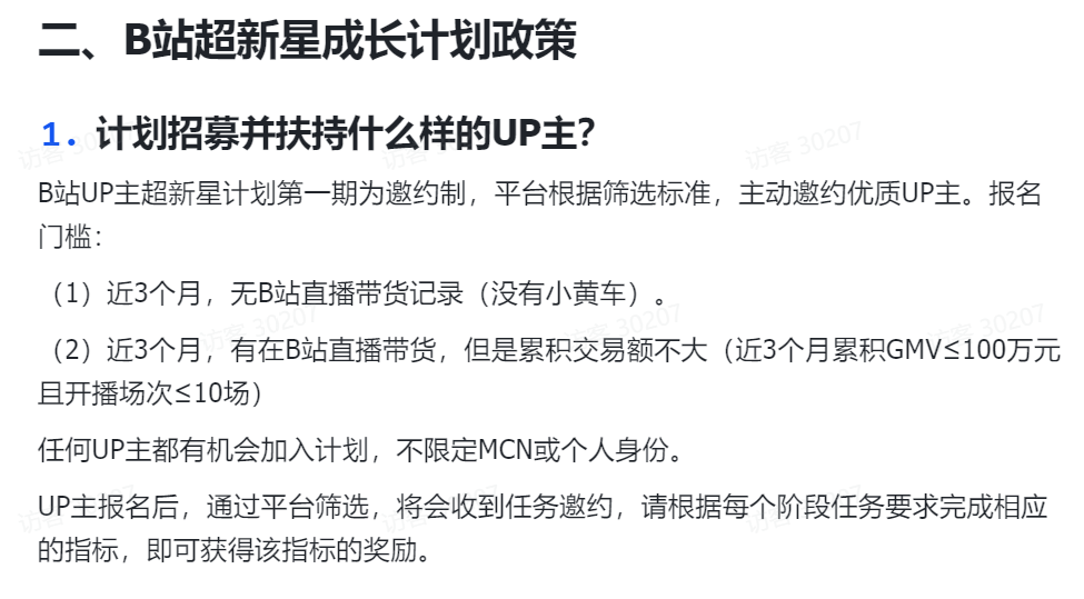 这一计划尚未放开招募,第一期采用邀请制,由平台筛选和邀请UP主加入。UP主达成不同阶段的运营目标,包括开播次数、开播时长、累计UV(独立访客)、累计GMV等,可获得价值数万元的“推广金”,也就是站内流量包。