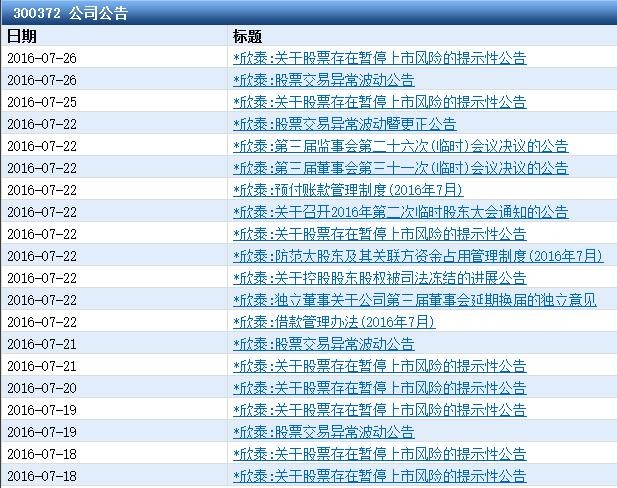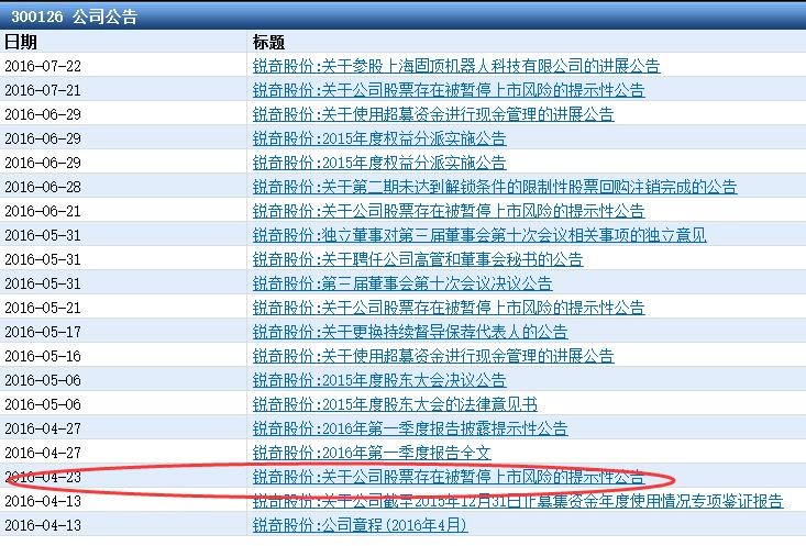 昨天A股刚有一只股票300126锐奇股份因“可能成为第二个欣泰电气”被吓得跌停,再回头看,公司几个月前就已经发过可能会被暂停上市的公告。