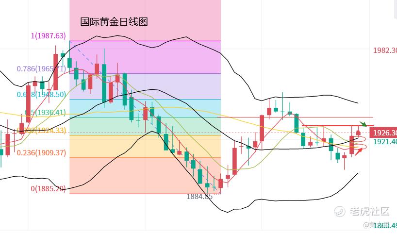 从之后的走势来看,黄金在日线5日均线到布林到中轨之间,即1914到1920美元范围窄幅震荡,直到美盘开盘后,金价向上突破布林带中轨1920美元压制,最高涨至1930美元遇阻,收盘前回落至1922美元。黄金向上突破后,短期趋势走强,试探1930美元,这基本符合我们的预期。本周一开盘,黄金回踩1922美元企稳,涨至1930美元遇阻,目前暂时交投于1920美元附近。