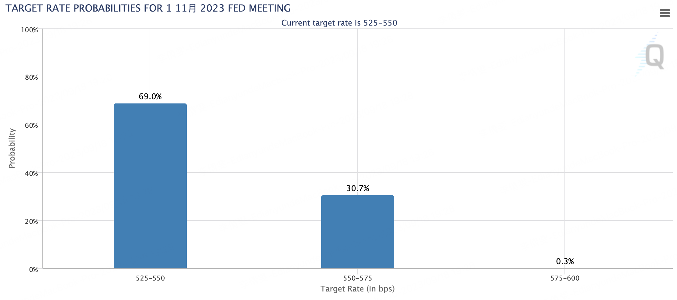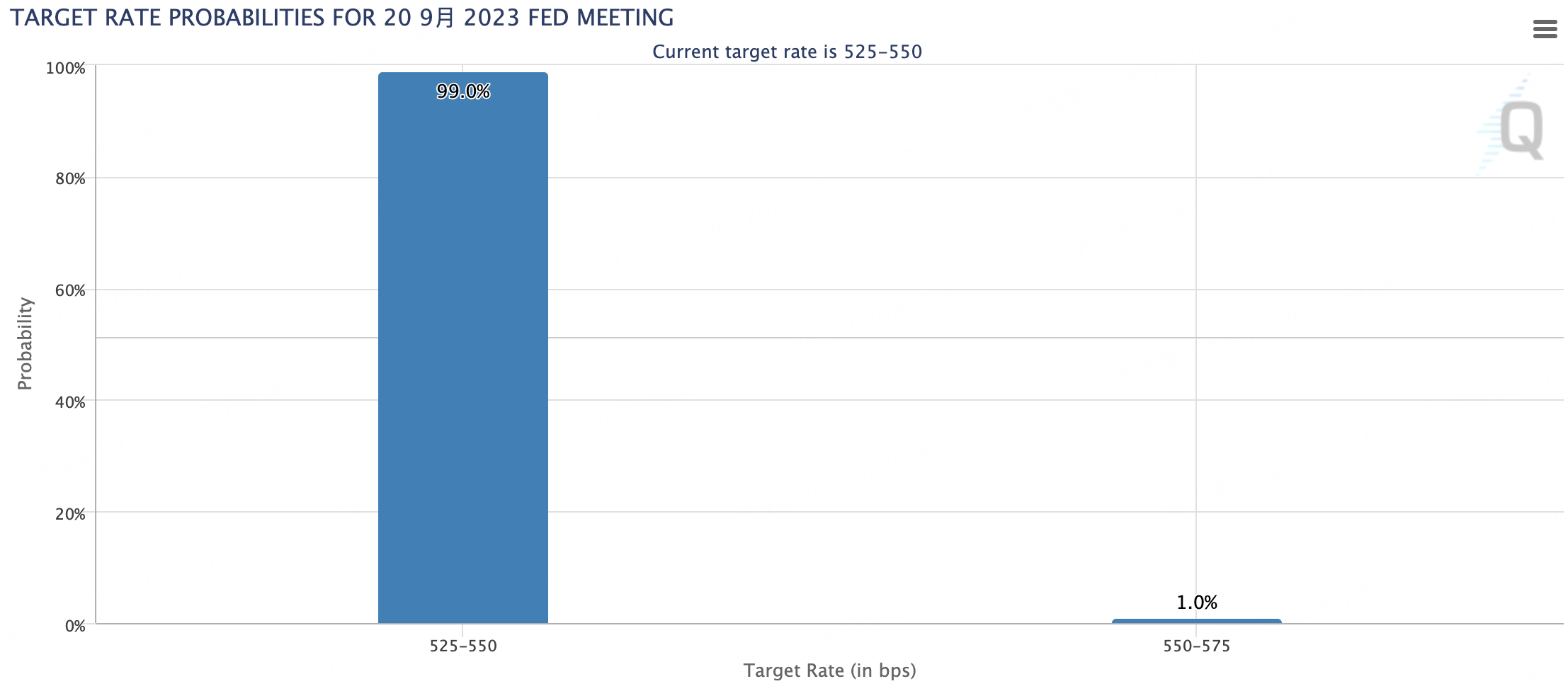 美联储将于9月20日(北京时间9月21日凌晨)公布利率决议,根据芝加哥商品交易所集团(CME Group)的 FedWatch 工具,交易员认为美联储在周三公布利率决定时有99%的可能性保持不变,11月加息的可能性仅为30.7% 。
