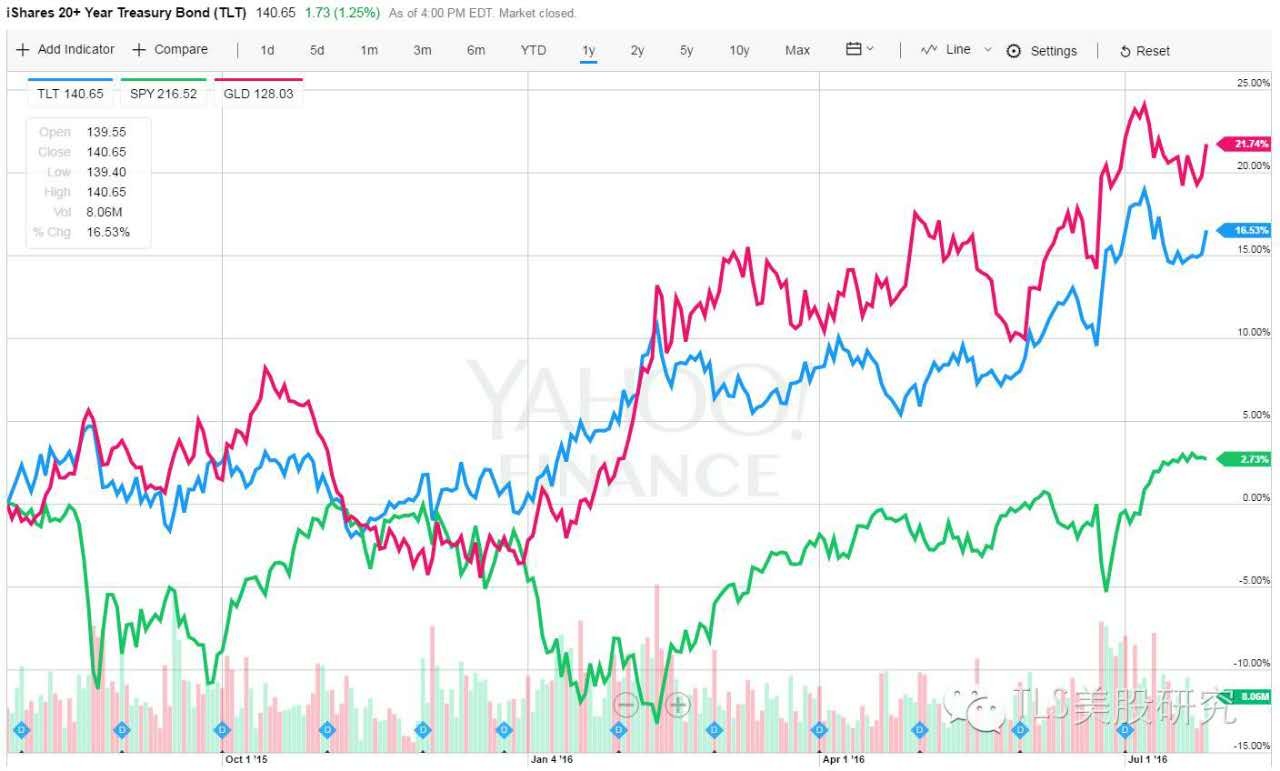 在利率可能走高的市场环境下,久期最为敏感的长期国债ETF$(TLT)$(下图蓝色)和黄金ETF$(GLD)$(下图红色)和标普500ETF(下图绿色)价格同步走高,