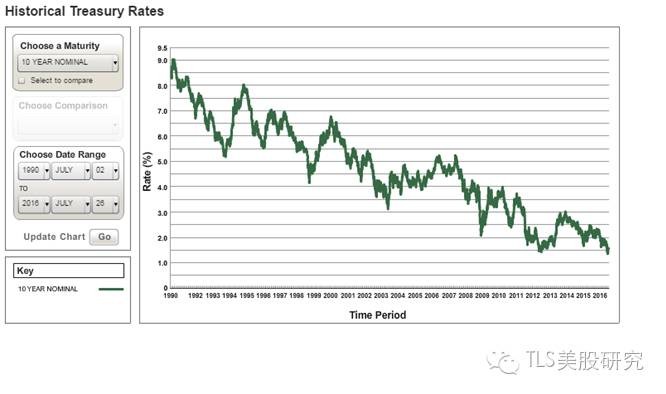 如图所示,由于避险需求和全球央行出手托住资产价格,目前的利率已经达到了30年来的最低位,本月初达到前所未有的1.37%(图从1990年起)。