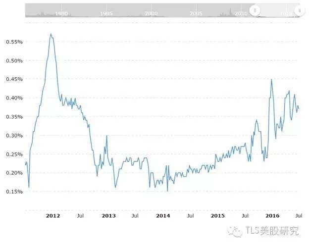 巧的是,从2011年夏到2012年夏欧债危机蔓延的一年中TED始终保持在0.25%的水平以上。