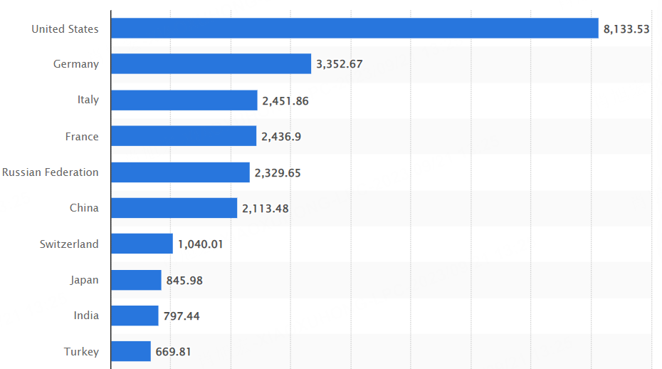 Gold reserves of largest gold holding countries worldwide as of 2nd quarter 2023(in metric tons):