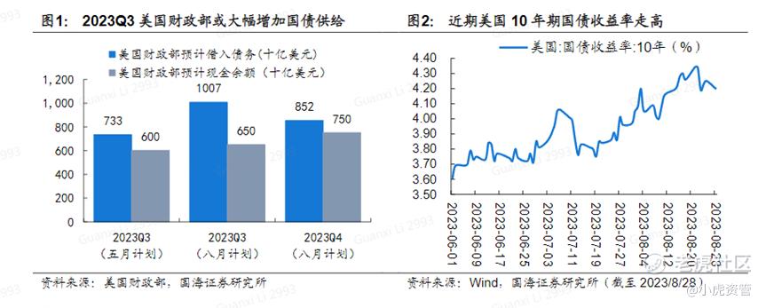 从美国货币政策来看,虽然美联储主席鲍威尔在9月的FOMC记者会上继续放鹰,高利率还会持续。但是即便美联储11月还有一次加息,从大周期来看,此轮加息已经渐入尾声。此外,正如我们在市场复盘:美国经济强韧性下,如何调整配置中说到,美国财政很难继续维持高利率下的利息支出,进而难以扩大财政支出,使美国经济的韧性将有所存疑。一旦经济影响到了就业市场,美联储的鹰派态度预计也会随之发生改变。