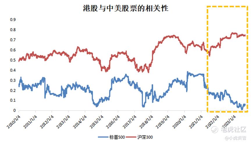 从近十年看,港股 $恒生指数(HSI)$ 与美股 $标普500(.SPX)$ 和A股 $沪深300(000300.SH)$ 的相关性走势可以看出,在大多数时候,港股与中美股市的相关性是处于同上同下的“共振”状态。但是,从2021年开始,两者出现了背离,港股与A股的相关性明显提升,与美股的相关性显著下降。