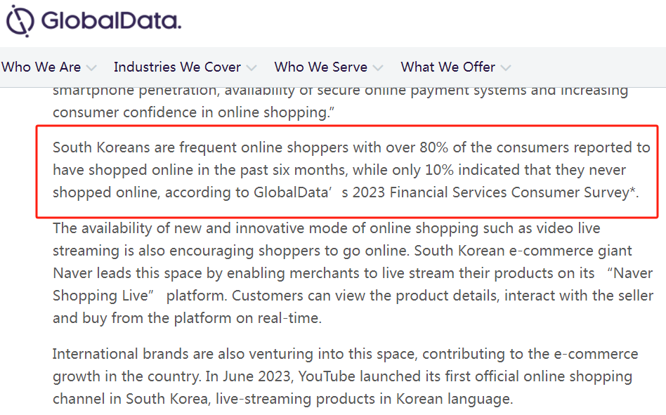 根据GlobalData发布的《2023年金融服务消费者调查》显示,超过80%的韩国消费者表示在过去6个月内网购过,只有10%的消费者表示从未网购过。而在2022年,韩国海外直购(海淘)规模更是达到了47.25亿美元。因此,韩国消费者对跨境网购的热爱程度可见一斑,这也给跨境电商的发展提供了坚实的用户基础。