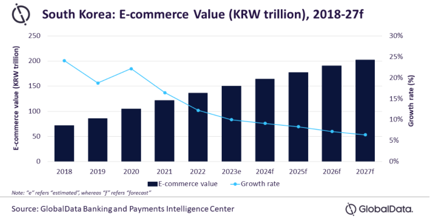 同样是来自GlobalData的数据表明,韩国电商市场始终呈现出持续爆发的态势,2022年该国电商市场规模达到了136.6万亿韩元,2023年韩国的电商销售额将同比增长10%。此外,在2023年至2027年期间,韩国电商市场的复合年增长率将达到7.7%,到2027年,这一市场规模有望突破202.6万亿韩国大关。