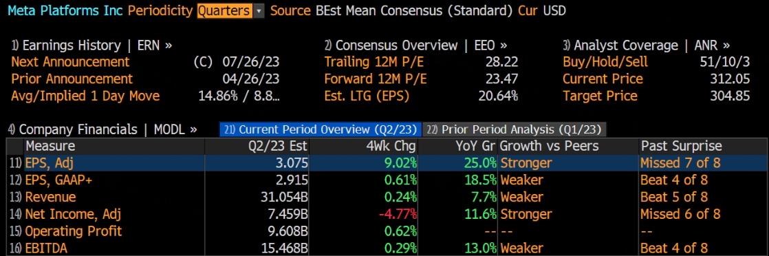 Meta将于7月26日美股收盘后(北京时间7月27日)发布2023年第二季财报。据彭博分析师预期,分析师预计 Meta 当季将实现营收 310.5 亿美元,调整后净利润 74.59 亿美元,调整后每股收益 3.075 美元。