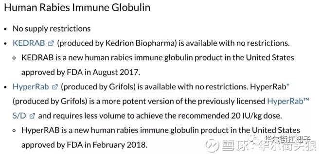 美国国家疾病控制中心网站上狂犬病的列表里 , 有狂犬病疫苗和狂犬病和狂犬病免疫球蛋白 。 其中狂犬病疫苗有两家公司 : 诺华制药 ( 瑞士公司 ) 和Sanofi Pasteur(赛诺菲一家法国公司 ) 。 人狂犬病免疫球蛋白有三家公司提供 : Kedrion Biopharma ( 美国未上市公司 ) , Grifols(盖立福 , 西班牙公司 ) 。 从来源上看 , 美国这类疫苗的主要供应商都是国外公司 , 美国也只有一家未上市企业在供应商里面 。 这才能得到全球最好的水平的疫苗 。