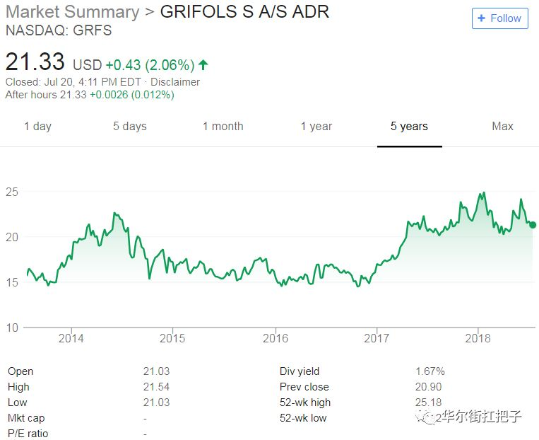 Grifols市值较小 , 186亿美元 , PE37倍 , 未来PE15 , 利润率15.7%. 年营收50亿 , 负债70亿 , 5年平均分红1.58% , 机构持股占68.25% 。$(GRFS)$