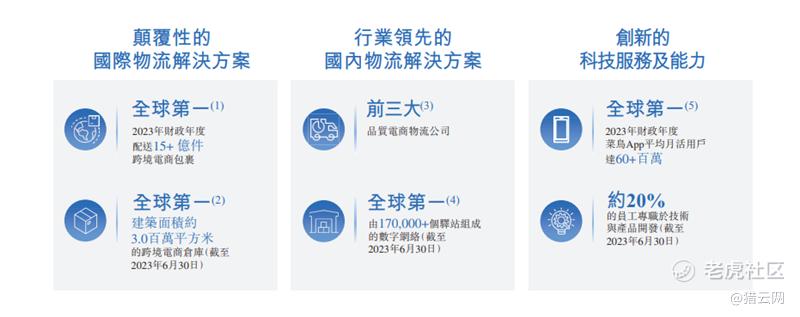 招股书显示,截至2023年6月30日,按建筑面积计,菜鸟运营全球最大的跨境电商仓库网络,总建筑面积约300万平方米。2023财年菜鸟向全球派送了超15亿件跨境电商包裹,服务超10万个跨境商家和品牌和1.33亿海外消费者。