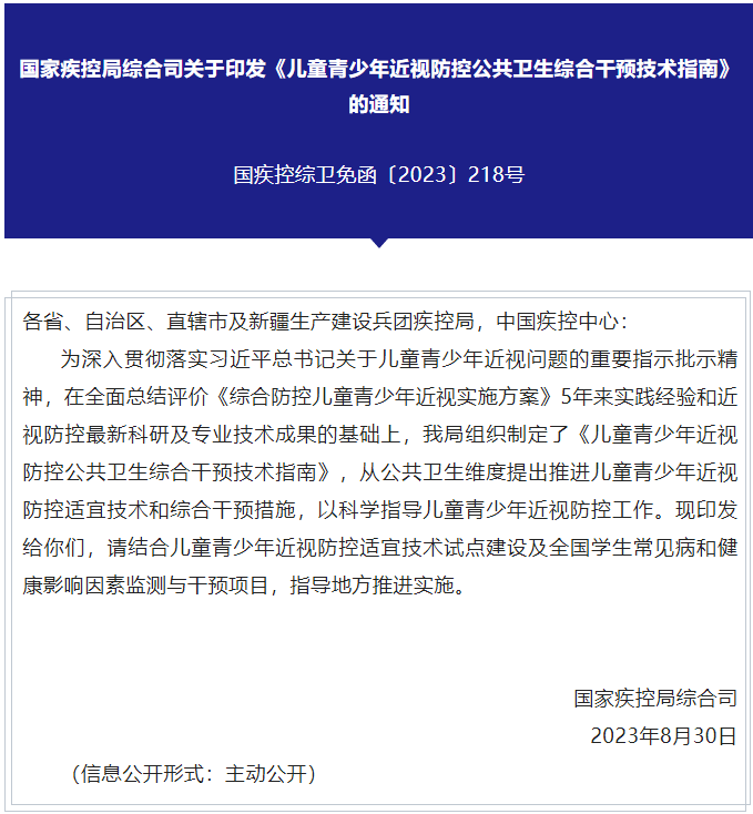 开学之际,国家疾控局组织制定了《儿童青少年近视防控公共卫生综合干预技术指南》。